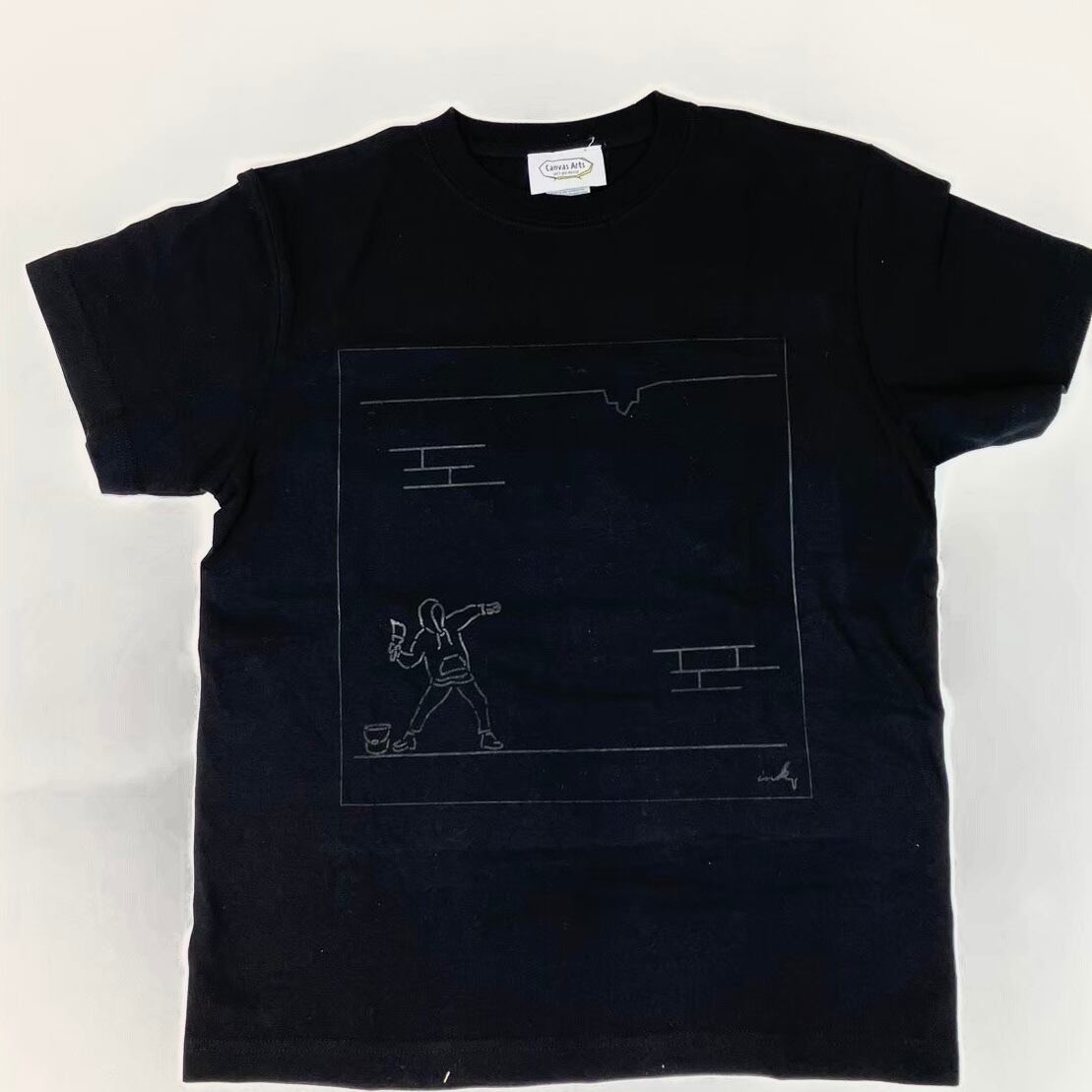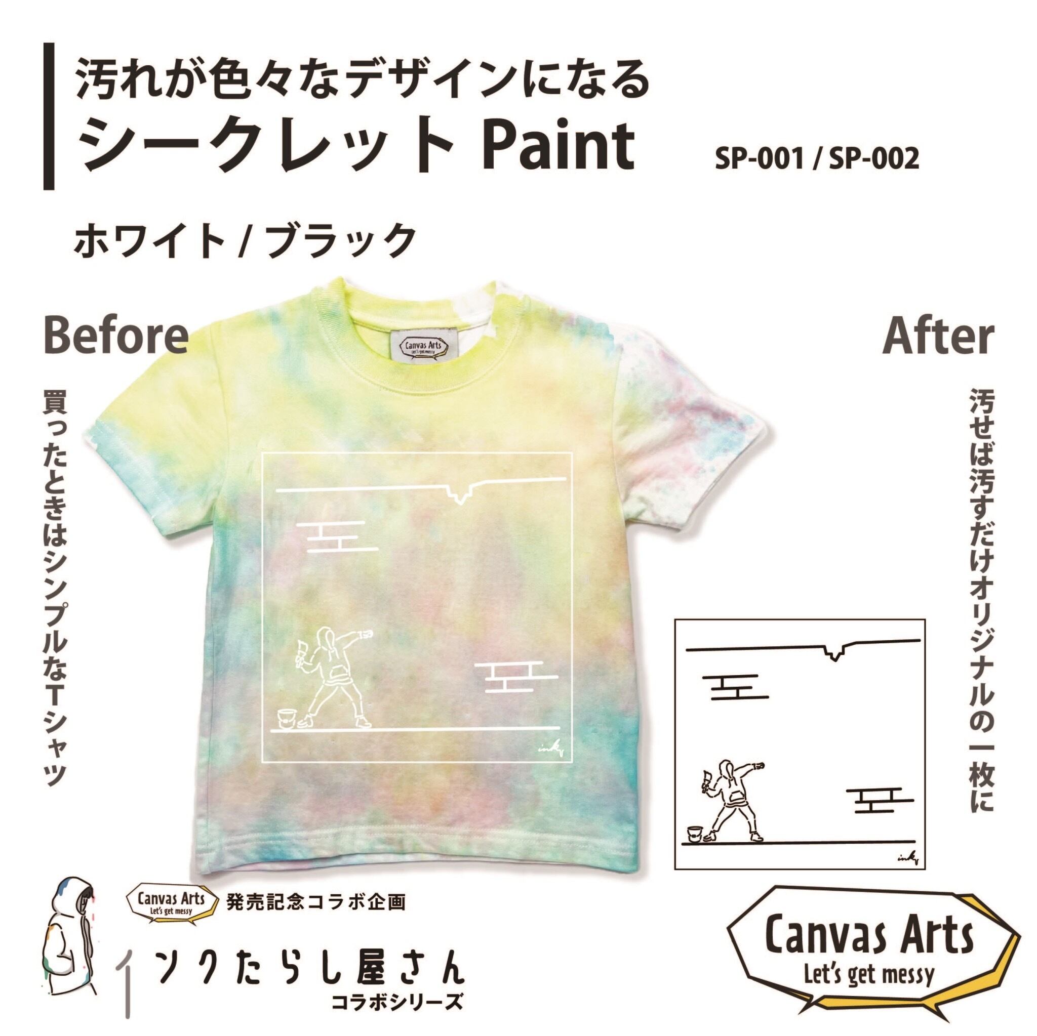 着る前はシンプルな、白×白、黒×黒の同色プリントのTシャツです。汚す事で、イラストの背景に色が付き、デザインになっていく仕様になっております。
